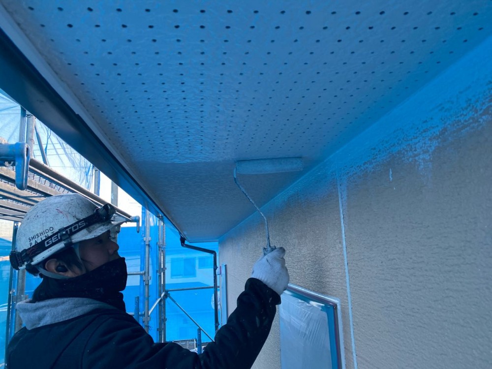 2階外壁の上塗りです。足場のシートが反射して青みがかって見えますが白色で綺麗に仕上がっています。