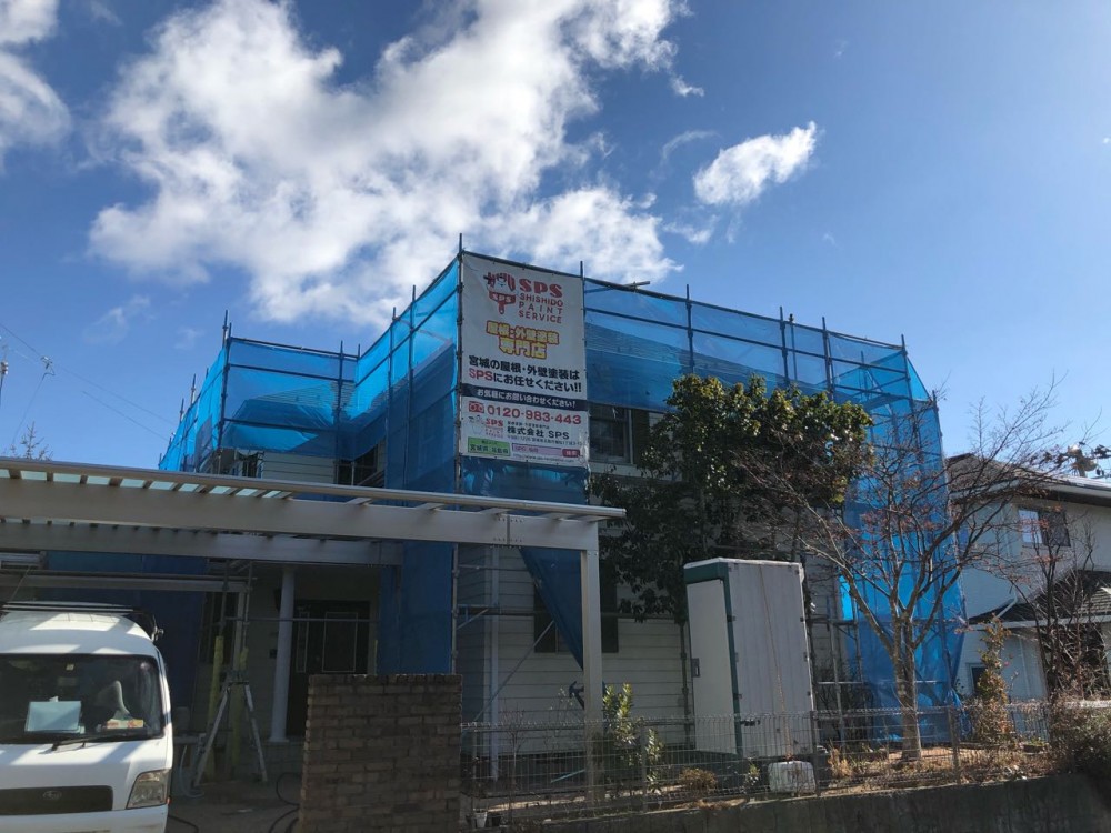 仕上がりのいい塗装工事はまず足元から、ということで安全作業できる足場をしっかりと設置させていただきました。
