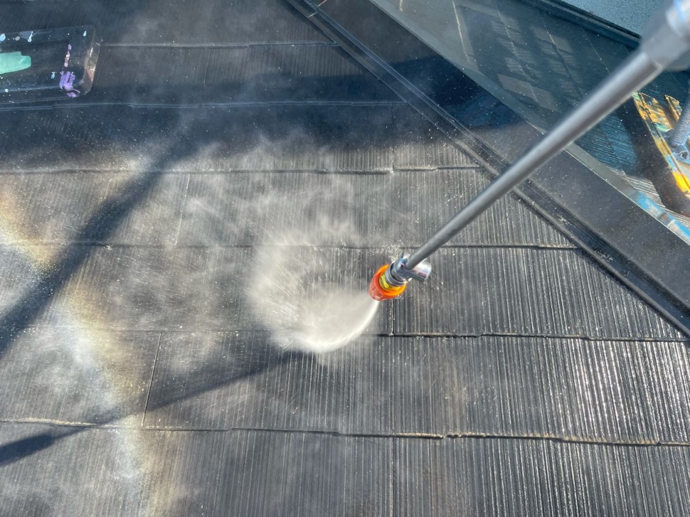 この屋根材は塗料をしみ込ませる性質があるのでしっかり目止めしないと仕上がり、耐久性が悪くなるので注意が必要です。
