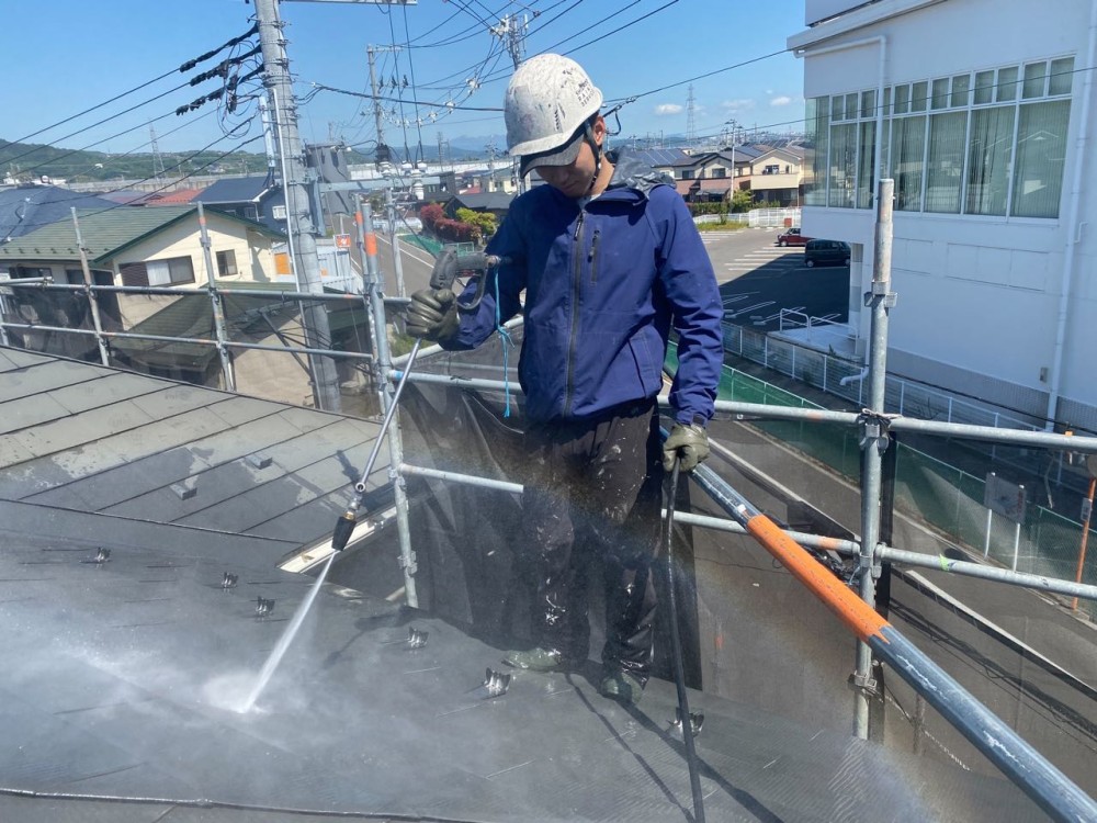 足場設置後、屋根、外壁を高圧洗浄します。