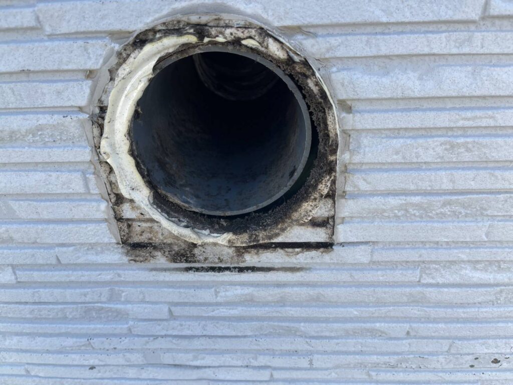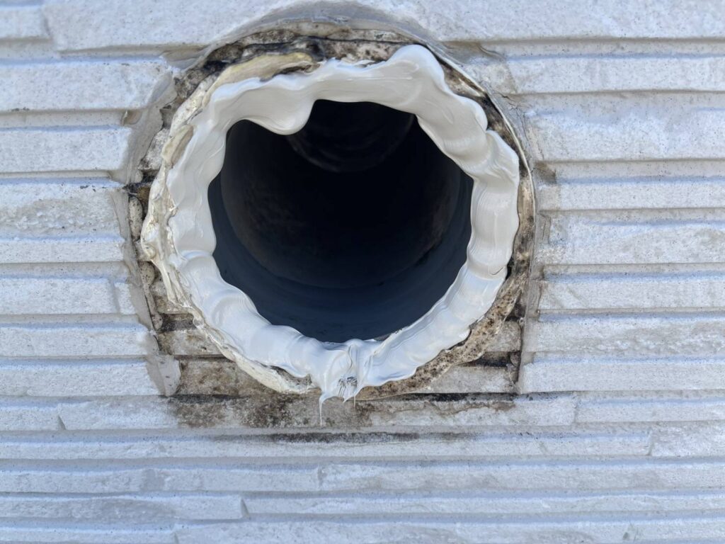 浴室外壁の部分では内部結露が原因の劣化があったため、換気フードまわりをしっかりシーリング補修しました。