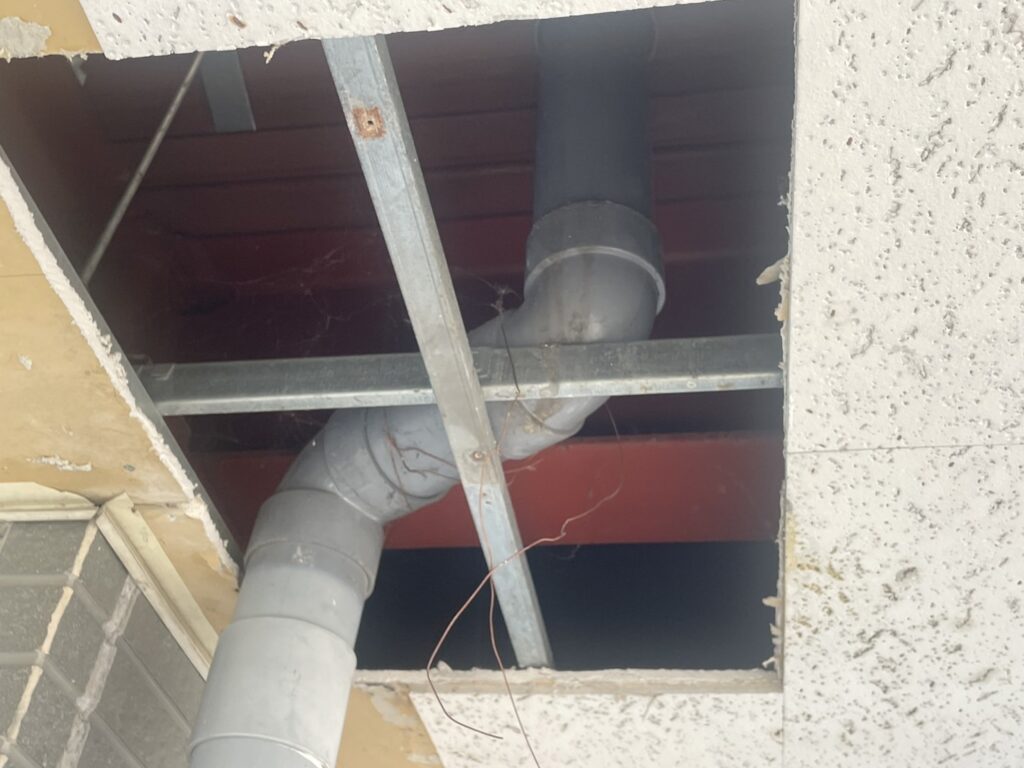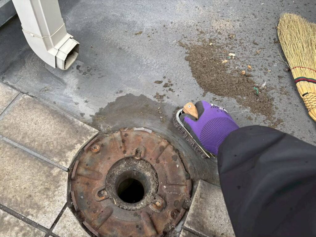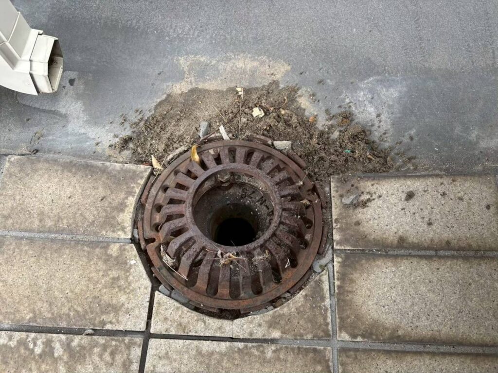 バルコニーのドレン(排水口)まわりでは、劣化による漏水が見られたため、