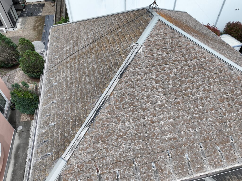 T様邸の屋根はスレート材で、紫外線や雨風の影響で塗膜の劣化が進んでいました。