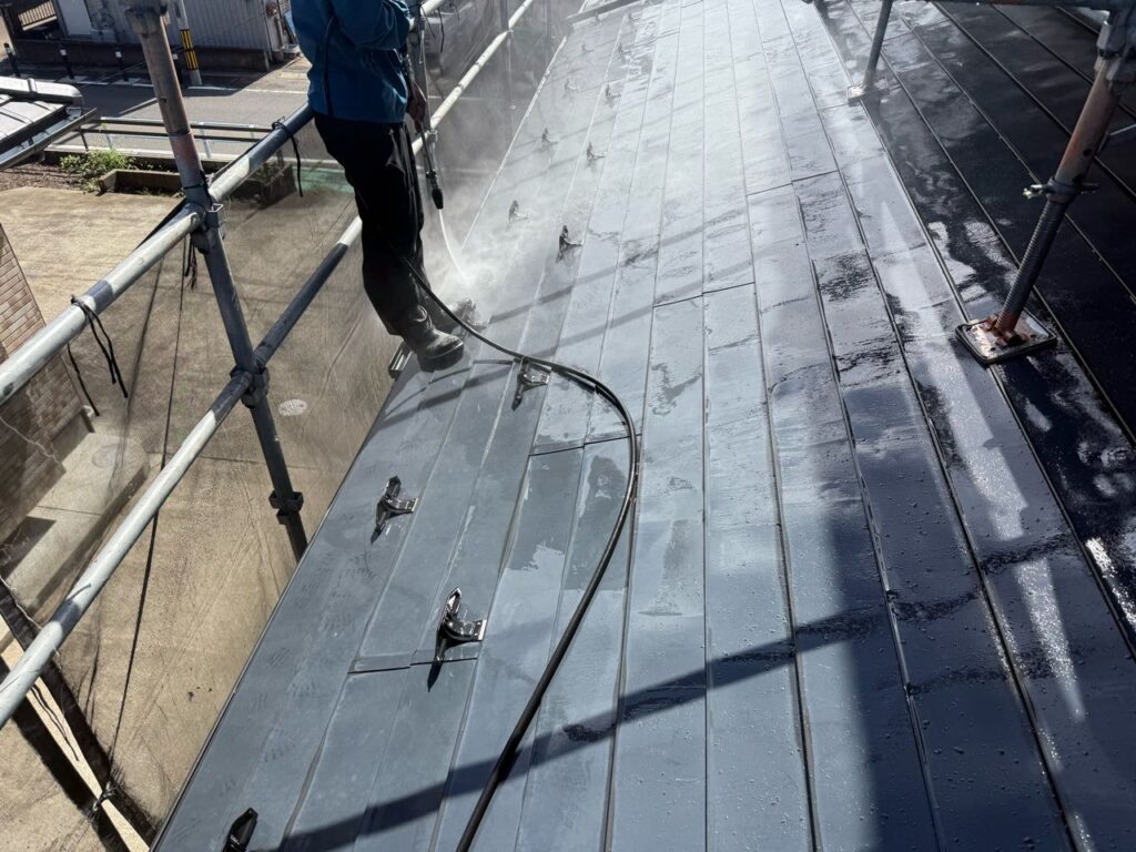 まずは安全に施工するための足場を設置し、高圧洗浄で屋根の汚れを落とします。