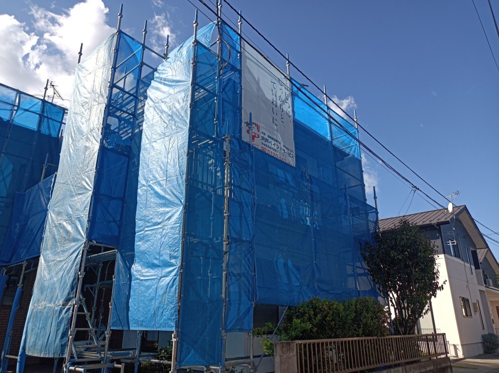 M様の塗装工事は足場架設後、高圧洗浄していきます。