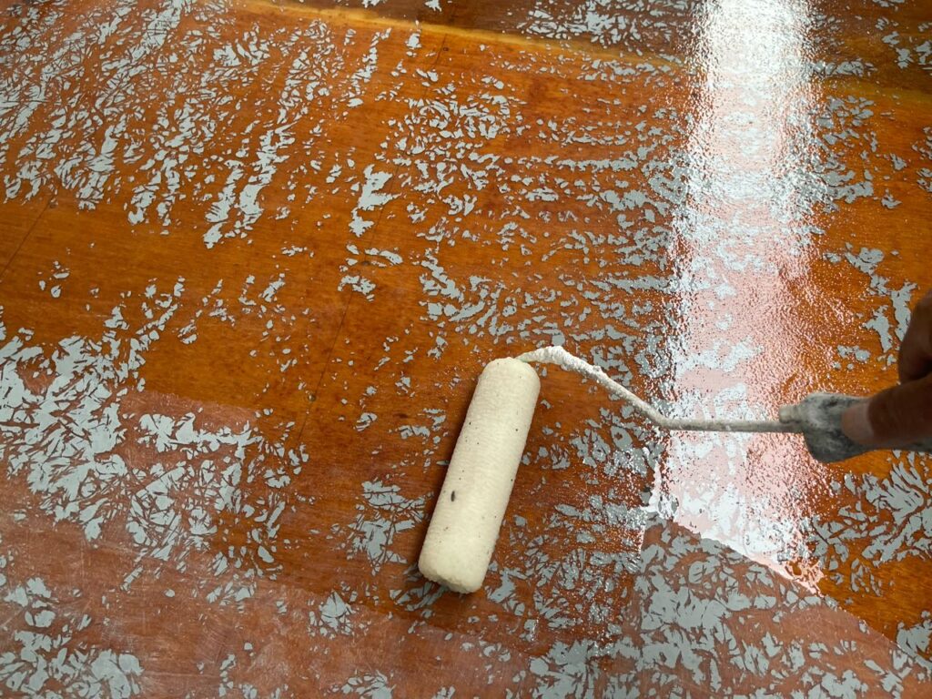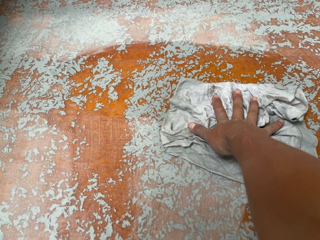 床は電動工具で研磨し、塗膜をはがしていきます。
