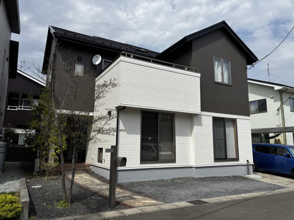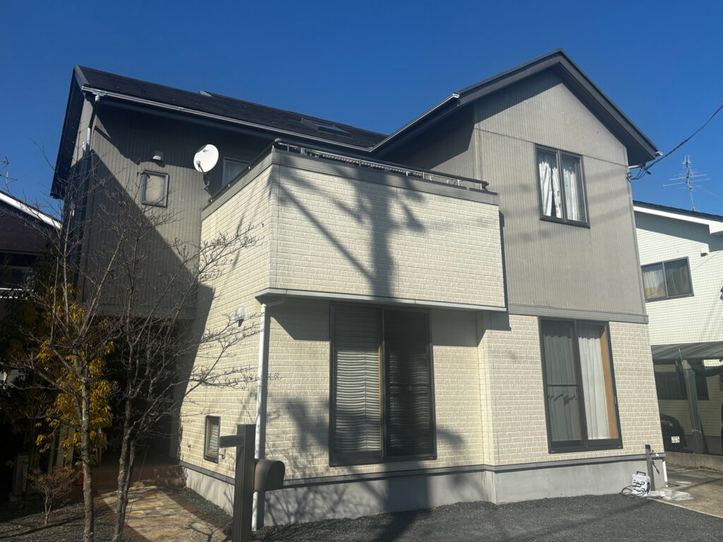 その後、シリコン系塗料で3回塗りを実施。今回の色分けは、1階と2階で異なるツートンカラー。しかも、艶感を控えた「3分つや」で、柔らかく高級感のある印象に仕上がりました。