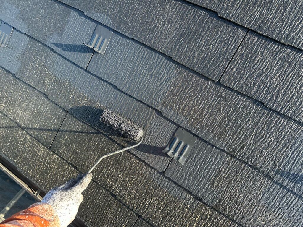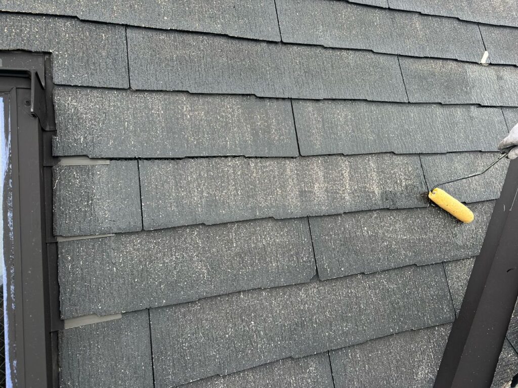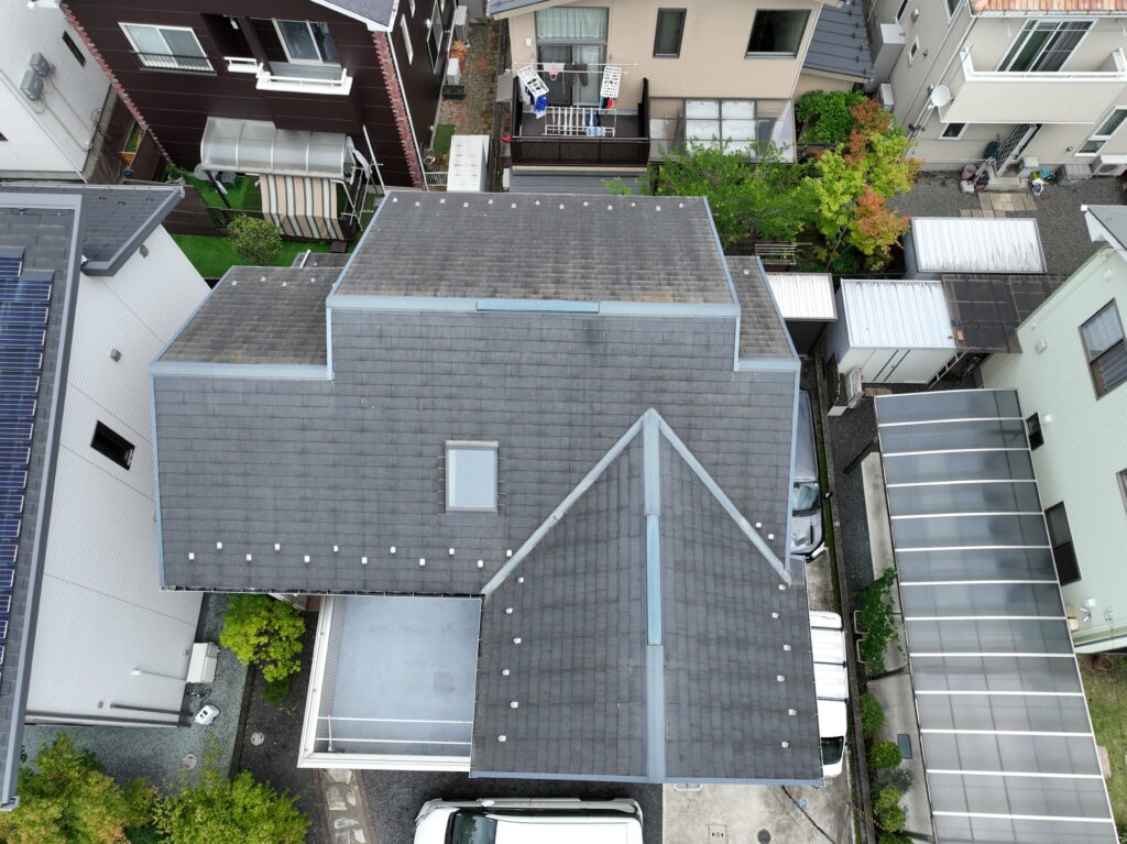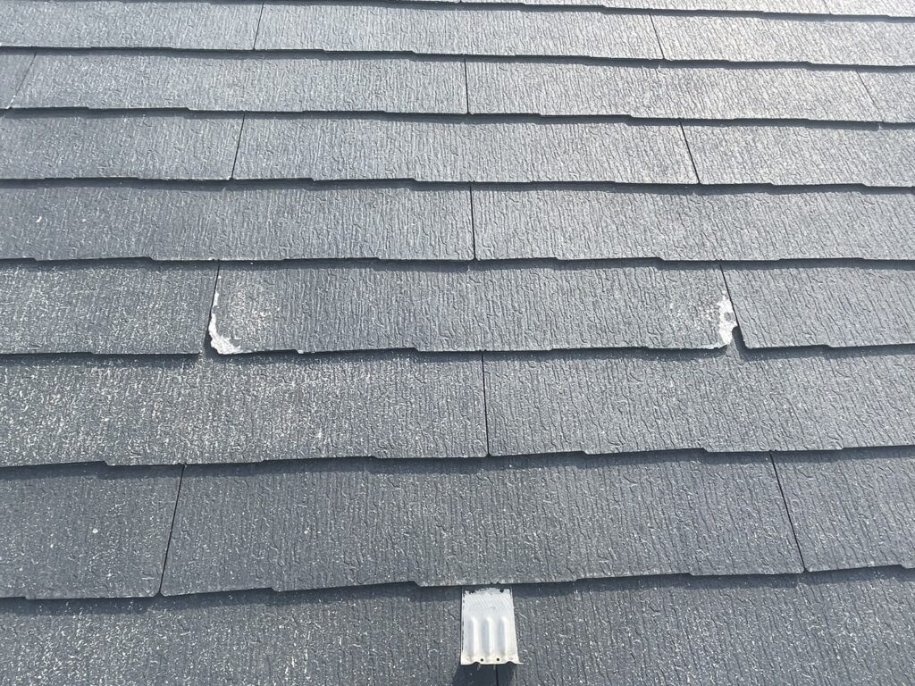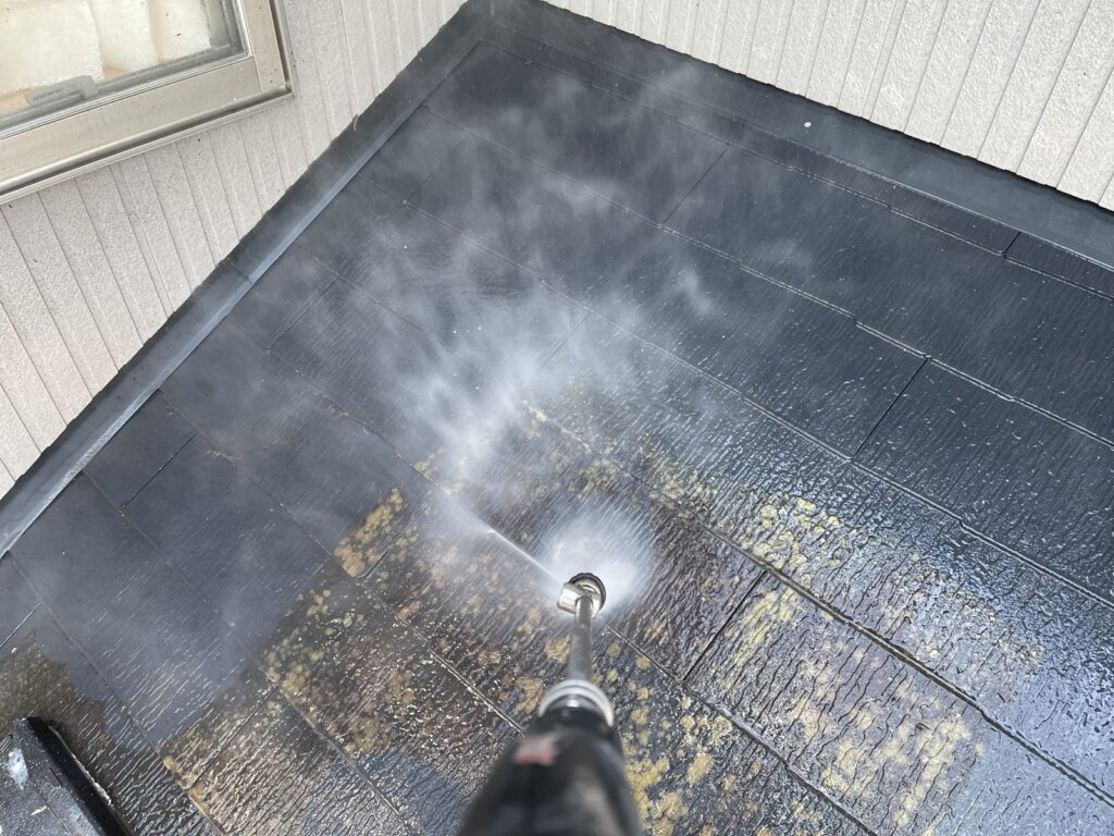 T様邸の屋根はスレート瓦。経年劣化による色褪せやコケなどが気になってきていました。まずは高圧洗浄でしっかりと汚れを落とします。