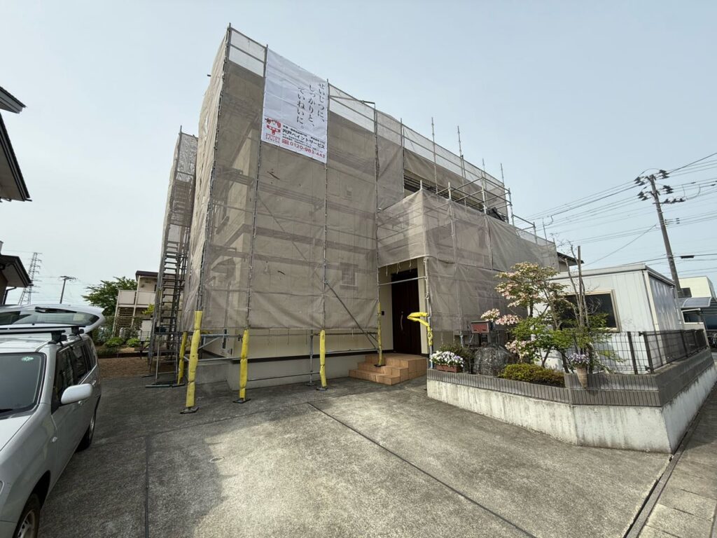まずは足場を設置し、高圧洗浄で外壁の汚れをしっかり落としていきます。