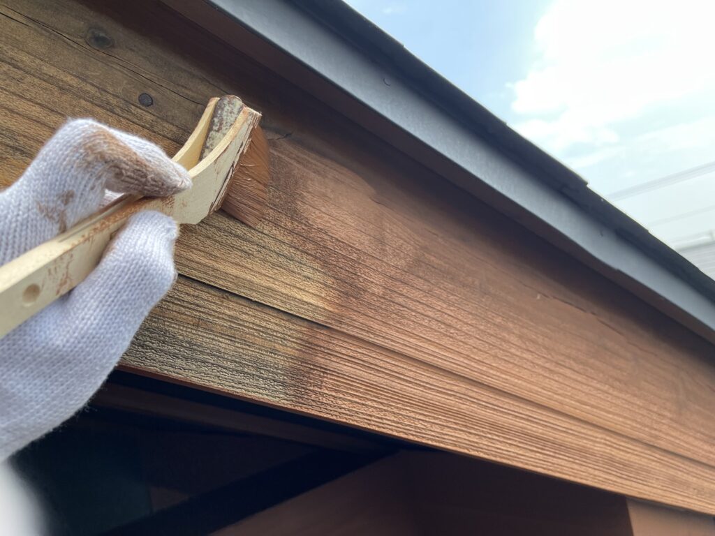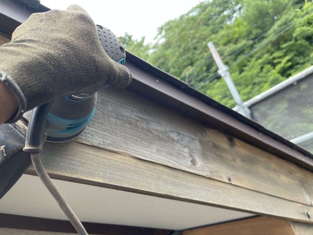 まずは電動工具で旧塗膜を丁寧に研磨し、下地を整えてから防腐効果のある塗料を2回塗り!