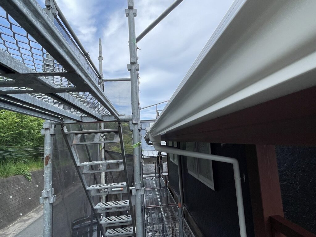 職人が安全に作業できるように組み上げ、塗料の飛散を防ぐための養生シートを丁寧に張っていきます。風通しや隣家への配慮も忘れず、しっかり準備を整えました💪