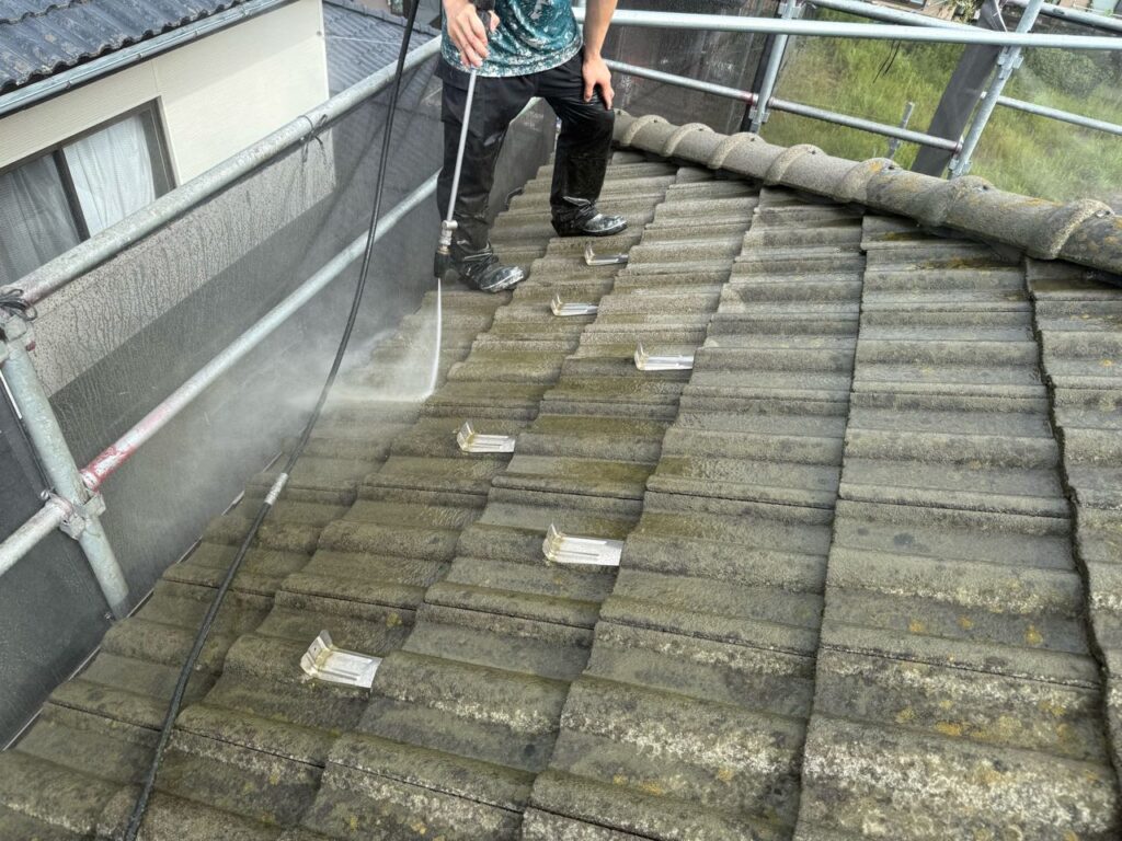 屋根と外壁の汚れ・コケ・古い塗膜を高圧洗浄でしっかり落とします。