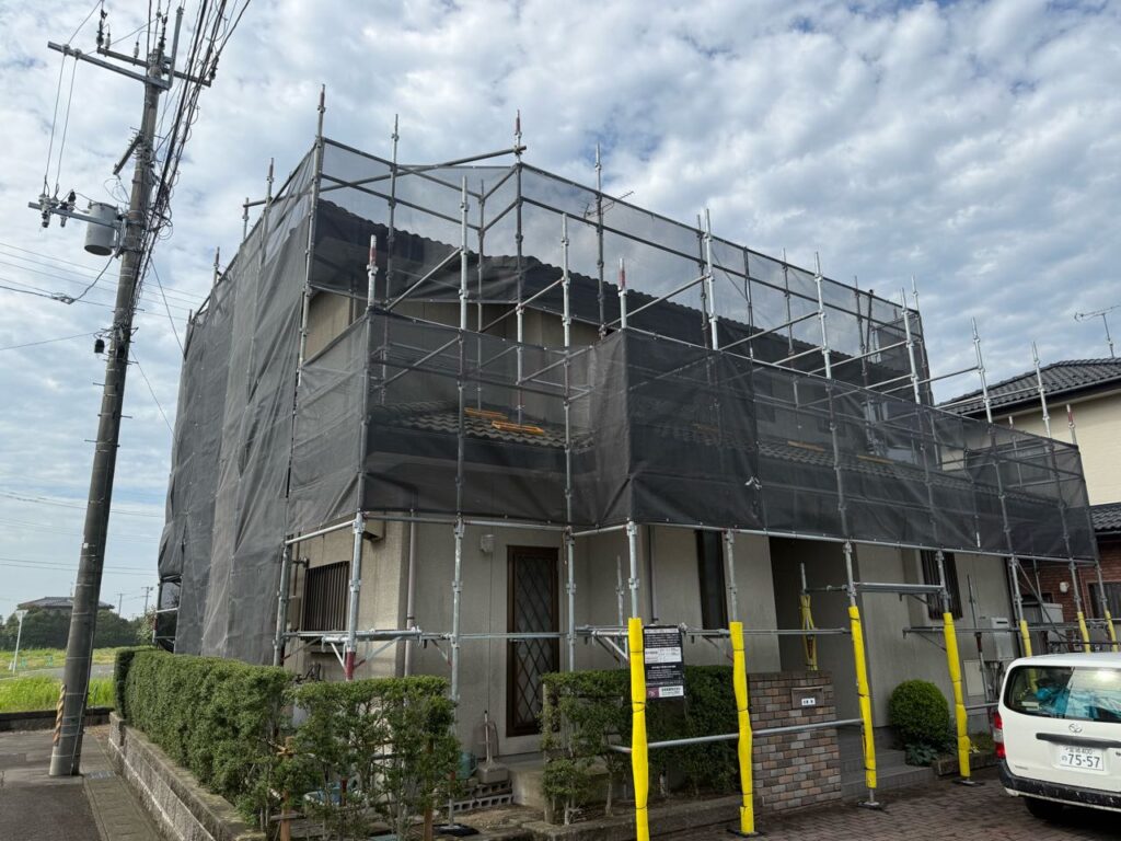 お隣に塗料が飛ばないよう、メッシュシートでしっかり養生!