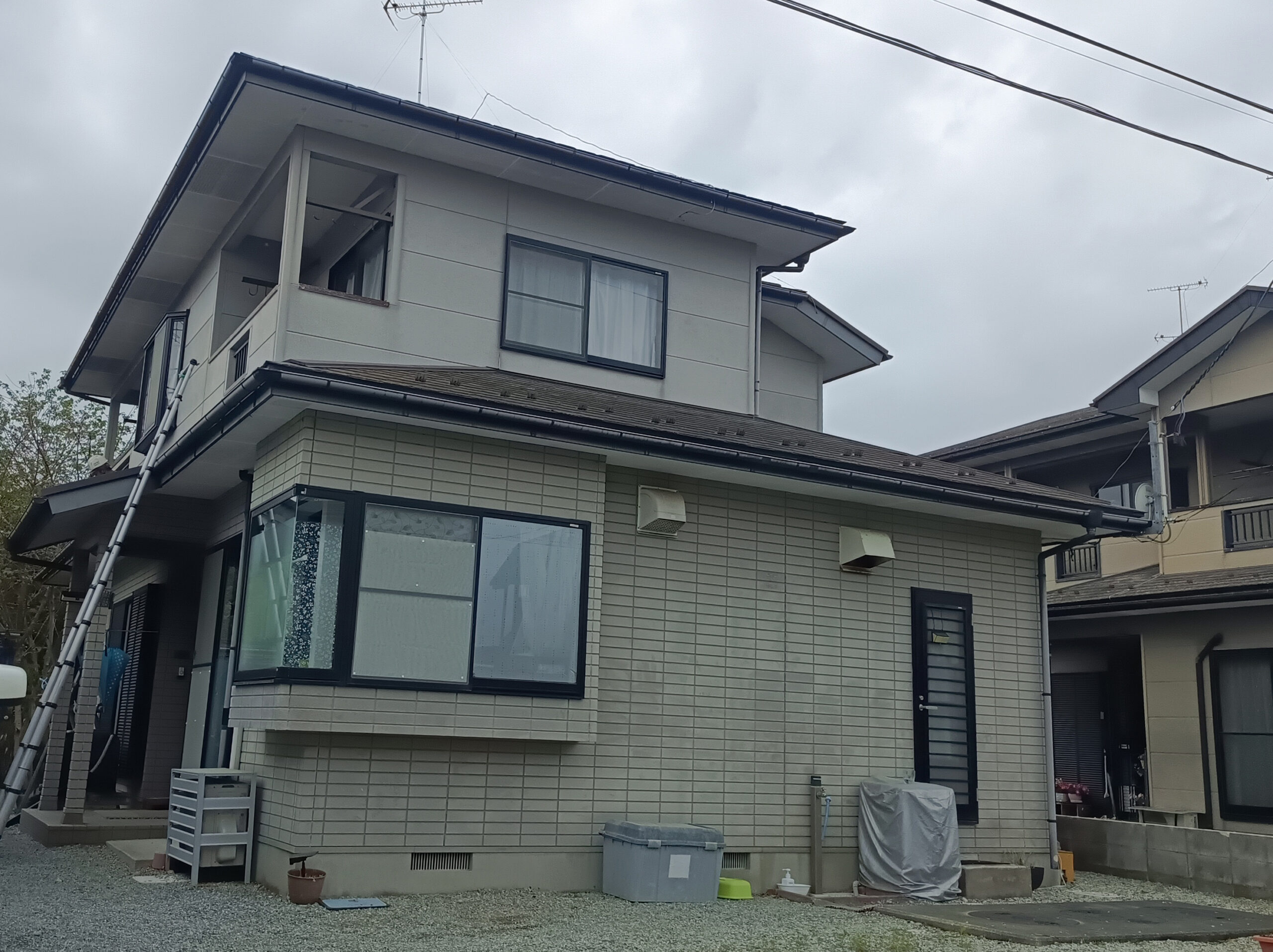 屋根はスレート材で、塗料が吸い込まれやすい性質があるため、下塗りを2回行ってしっかりとした下地を整えてから中塗り・上塗りの合計4回塗りで仕上げました。外壁にはチョーキング現象が見られたため、高圧洗浄で粉状の劣化塗膜を洗い流した後、ラジカル制御形塗料による3回塗りで美しく仕上げています。