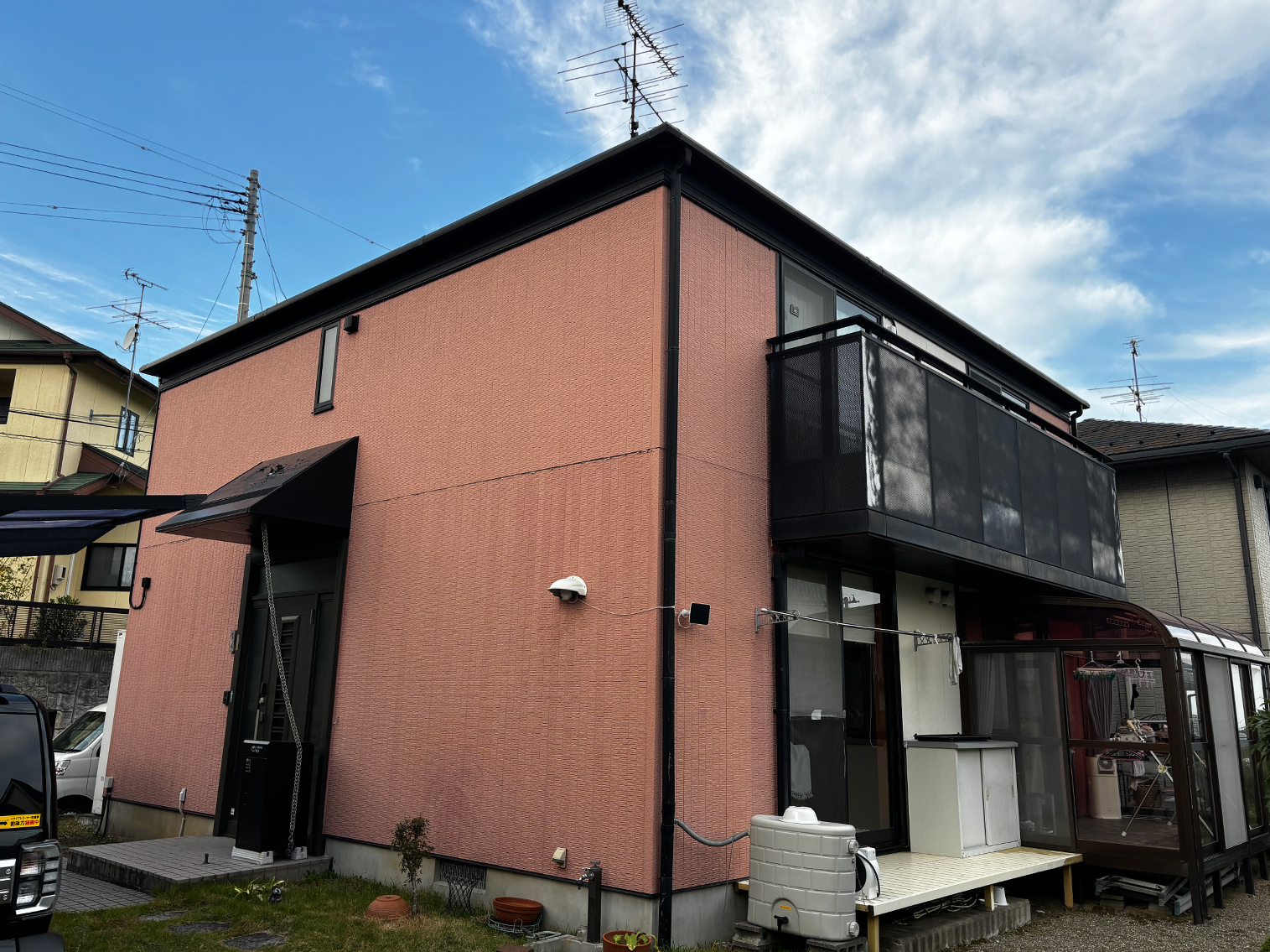 屋根はスレート材で塗料を吸いやすいため、下塗りを2回実施。しっかりと下地を整えてから、無機塗料で中塗り・上塗りを行いました。外壁も高圧洗浄で汚れをしっかり落とし、同様に3回塗りで仕上げています。テレビアンテナは足場設置時に安全に撤去いたしました。全体として、長持ちで安心できる外観へと生まれ変わりました。