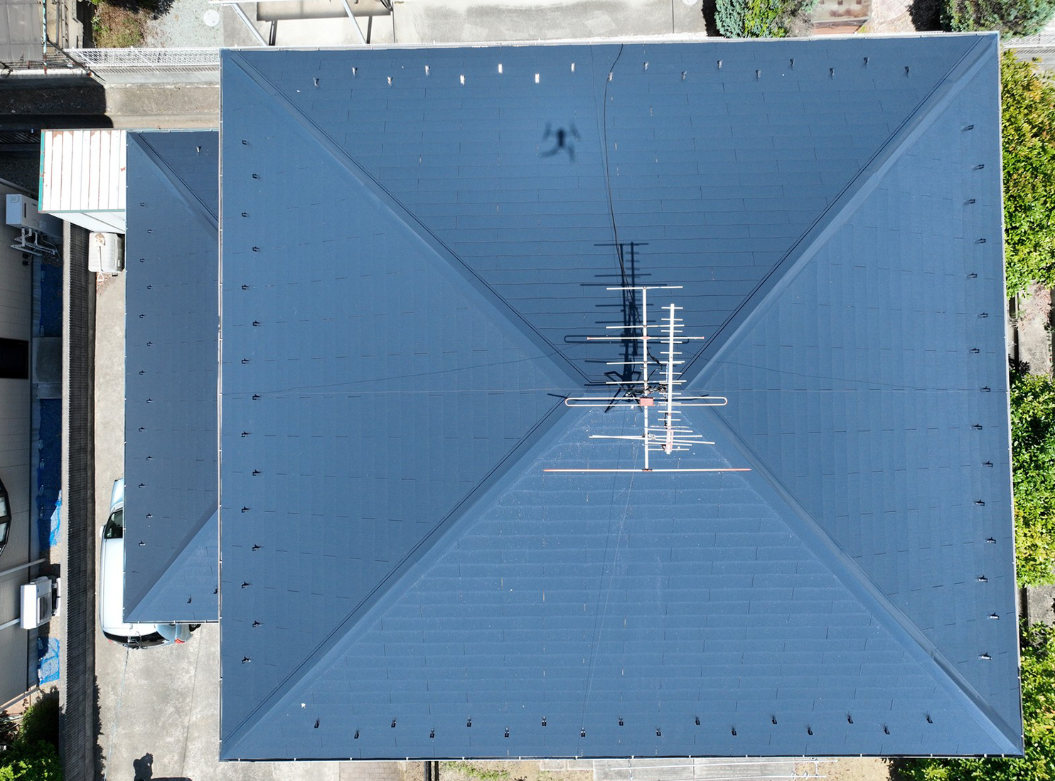 屋根はスレート材で劣化が進んでいたため、通常4回塗りのところを5回塗りで対応。下塗り3回+中塗り・上塗りで強靭な塗膜を形成し、耐久性を高めました。さらに付帯部も含め全体を丁寧に仕上げることで、風災に強く、長く安心できる住まいへと改善しました。