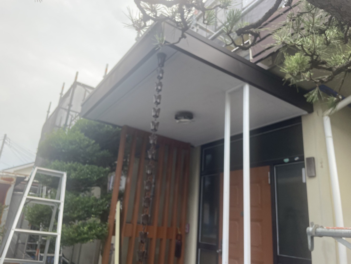 軒天は一部で錆が進行していたため、雨水の侵入経路を特定し、張替えを実施。玄関まわりの破風は木部が痩せていたため、軽量で耐久性の高いガルバリウム鋼板でカバー工法を行いました。