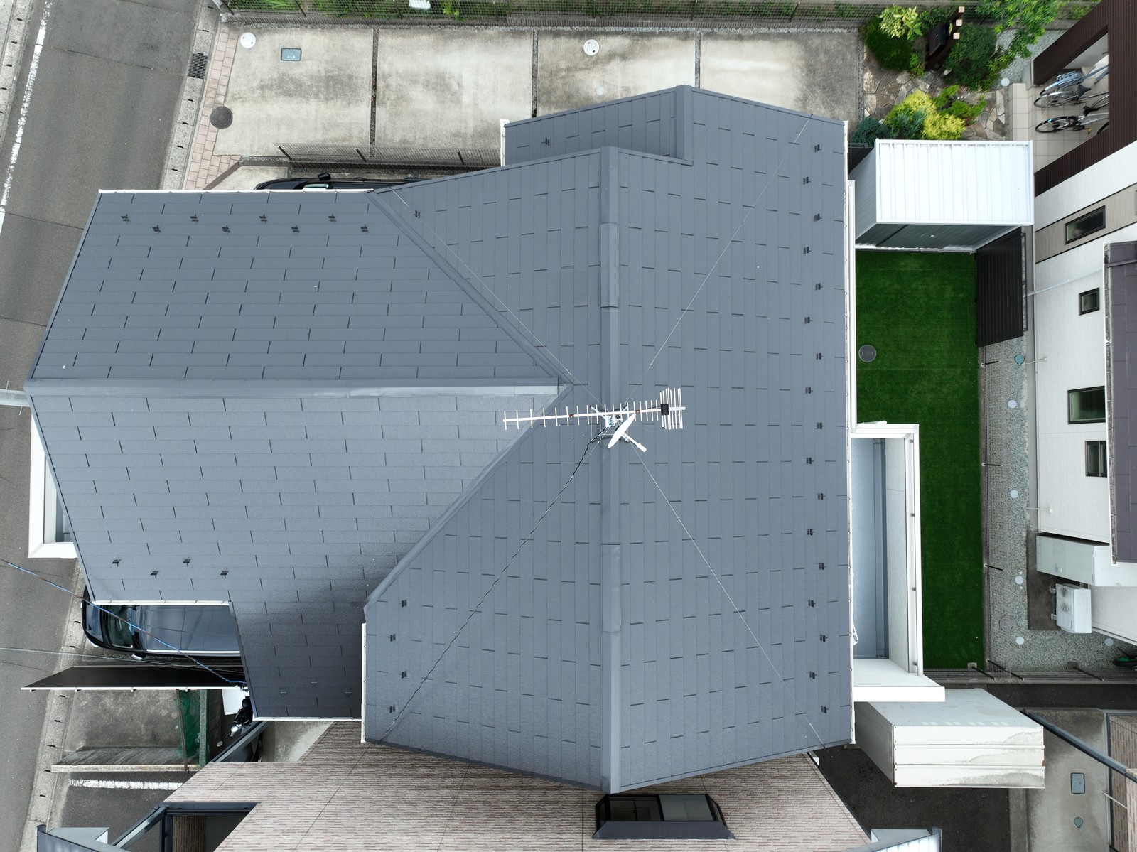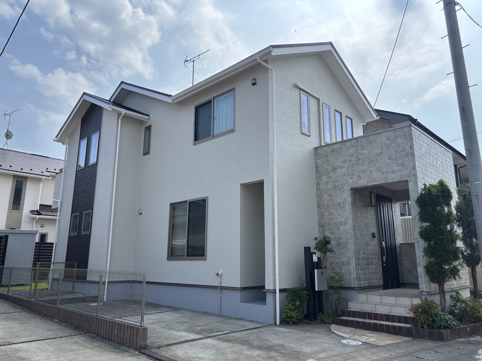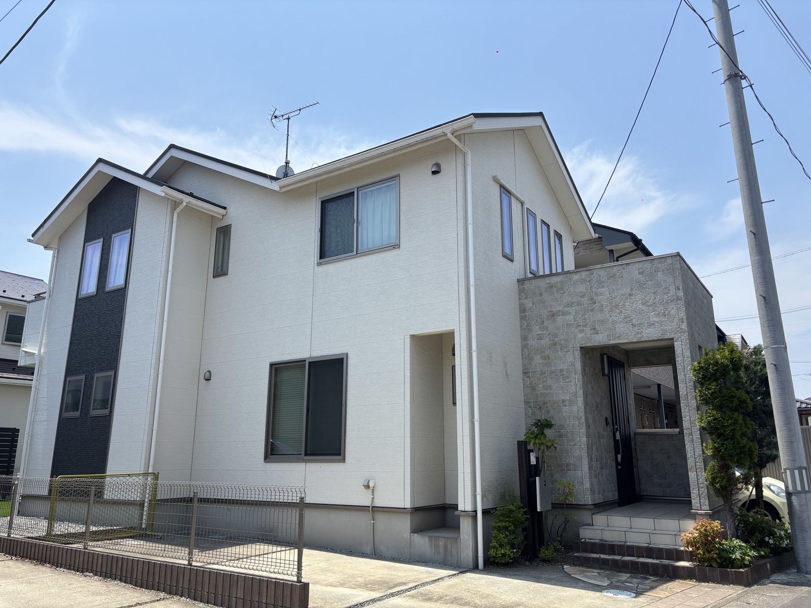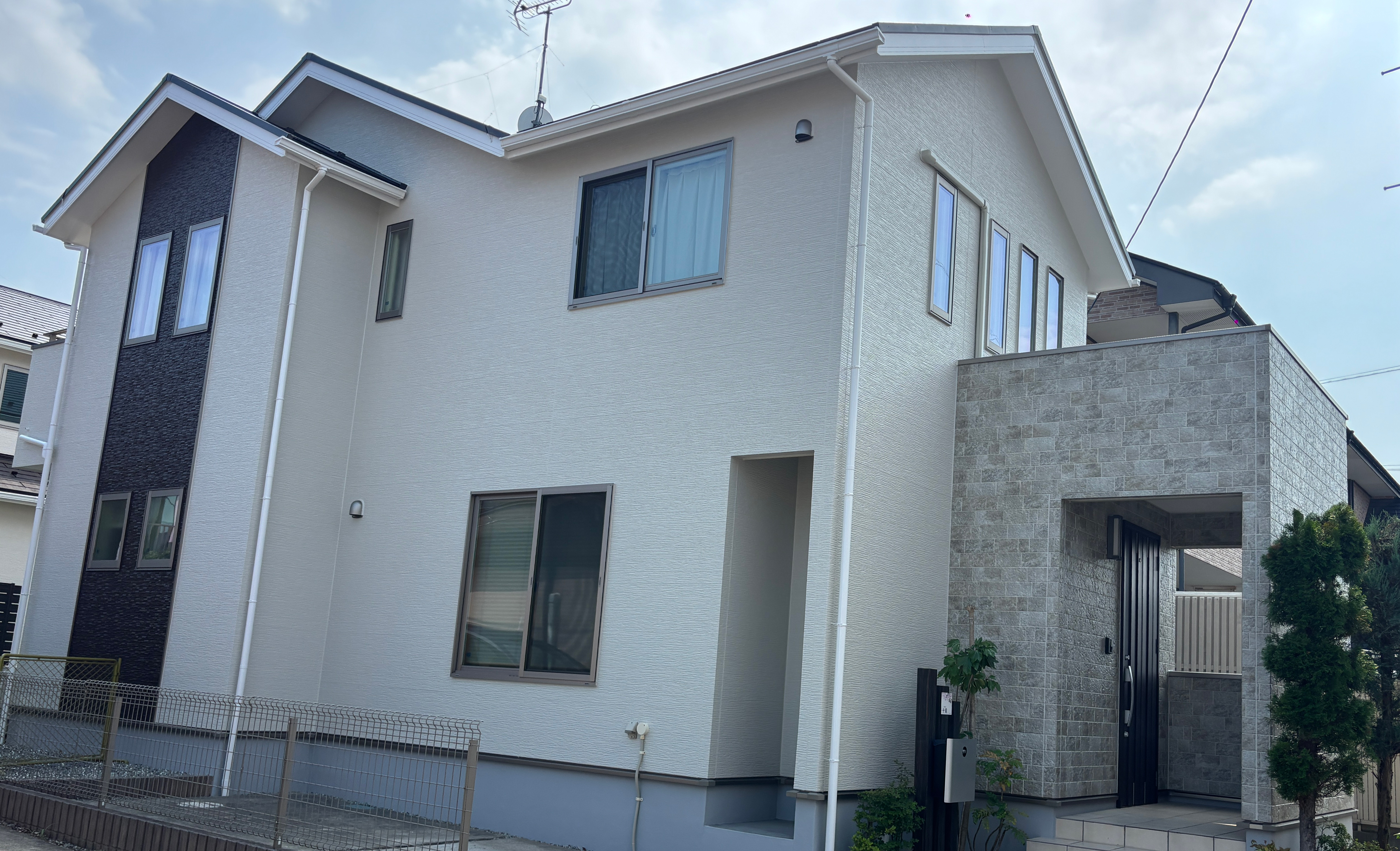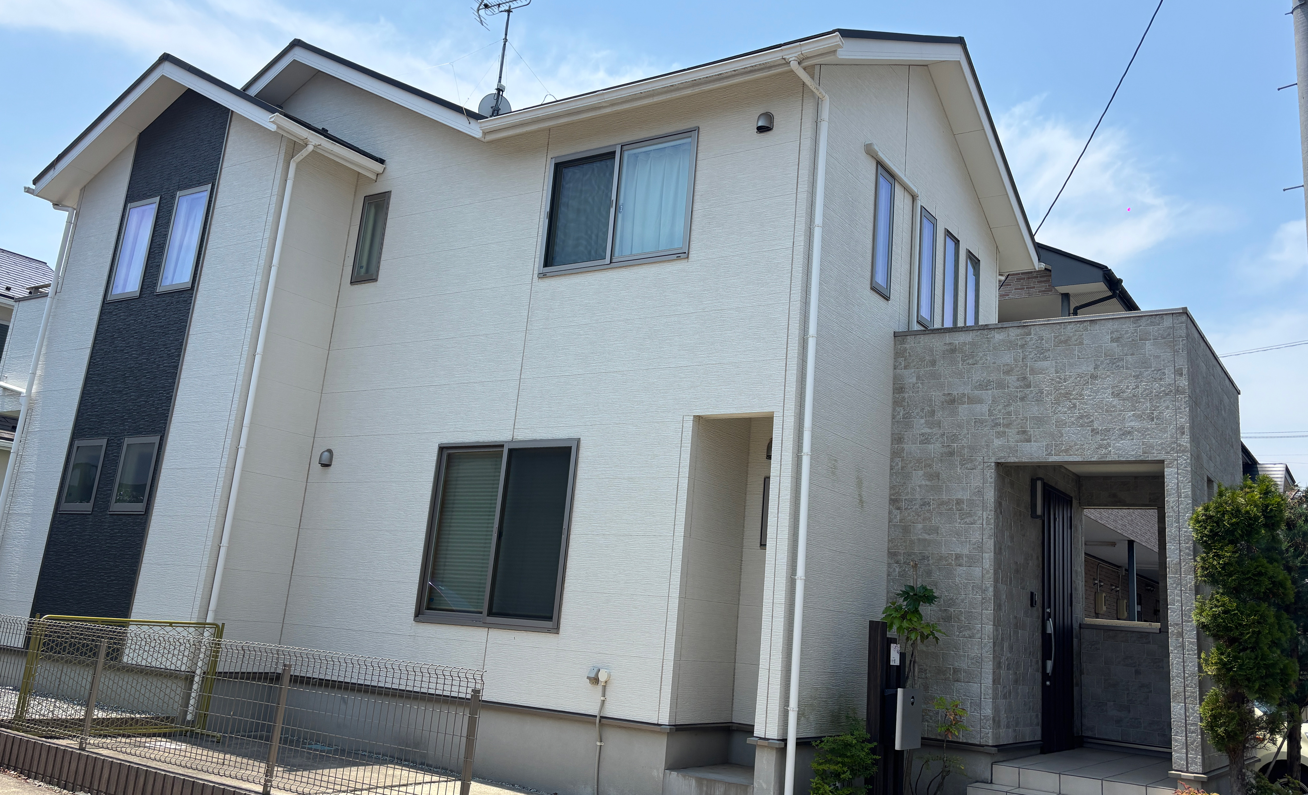 診断の結果、外壁は色あせとシーリング割れ、屋根はコケの付着が確認できました。外壁は高圧洗浄後に3回塗り、屋根は4回塗りで、それぞれ耐久20年の無機塗料をご提案。玄関前のタイル調外壁は風合いを活かすクリアー塗装で仕上げました。