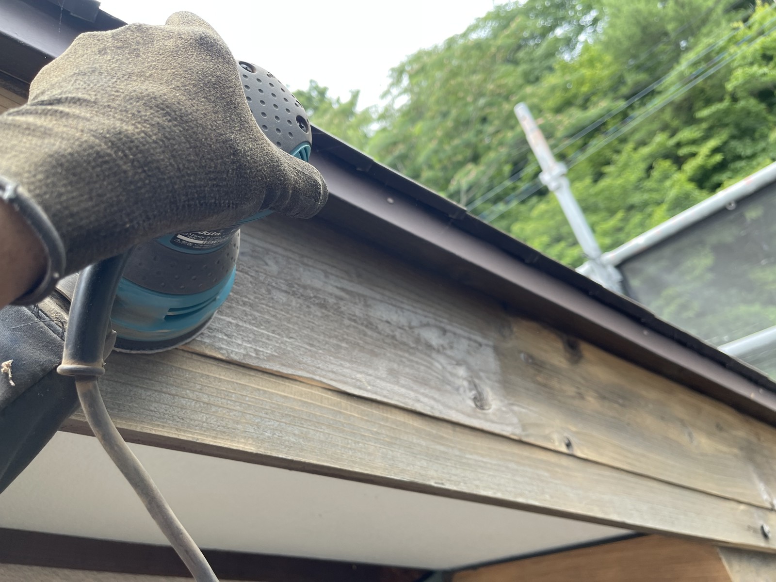 破風は、木製です。電動工具を使用して研磨しました!防腐塗料を塗って仕上げていきました。