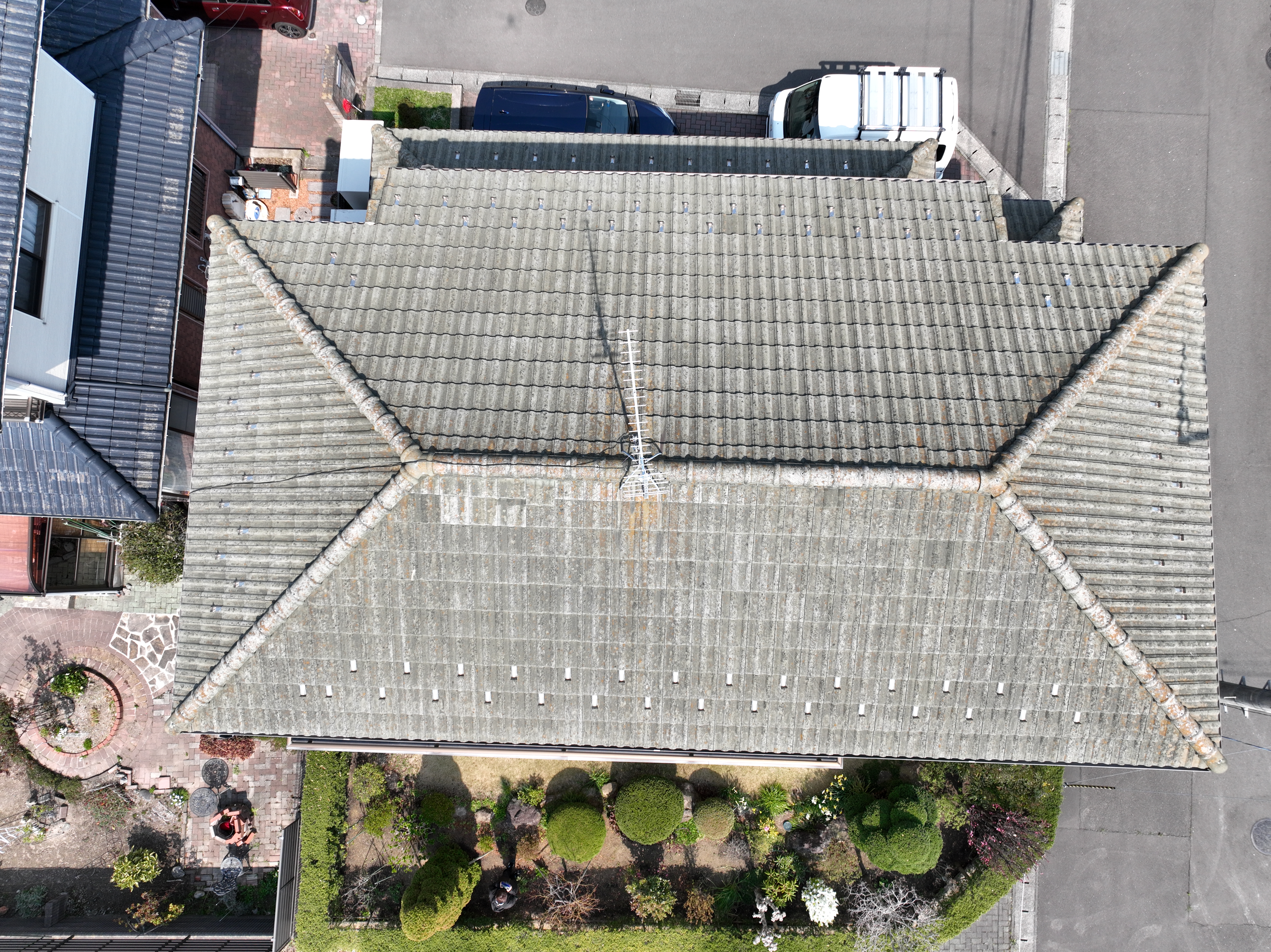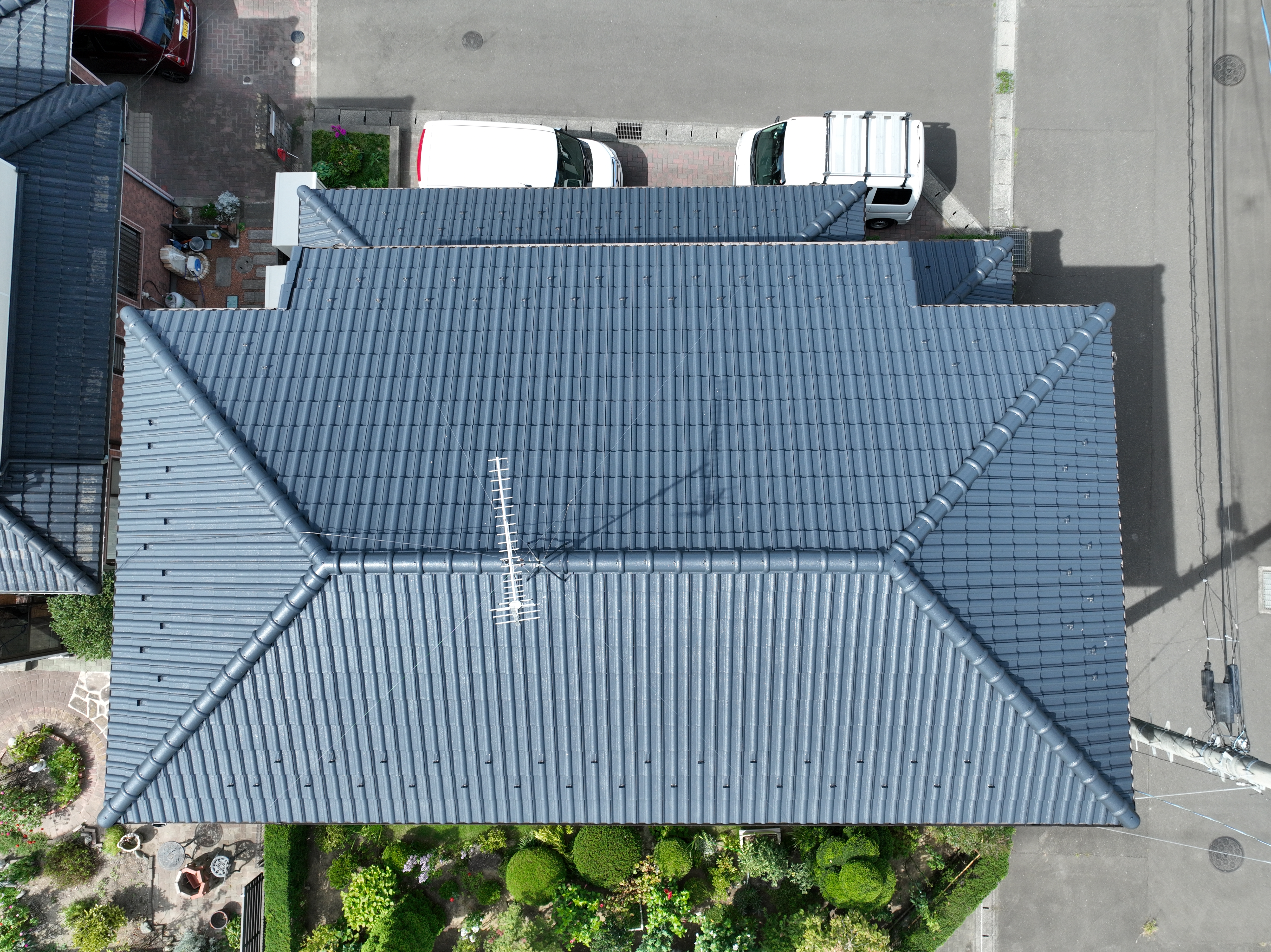 まずは高圧洗浄で屋根と外壁の汚れをしっかり除去。そのうえで、屋根には**水谷ペイント「パワーシリコンマイルド」**を採用し、耐候性と撥水性を高めました。